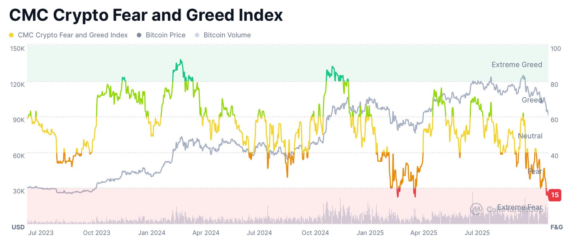 The CMC Crypto Fear & Greed Index echoed this panic with a reading of 15.