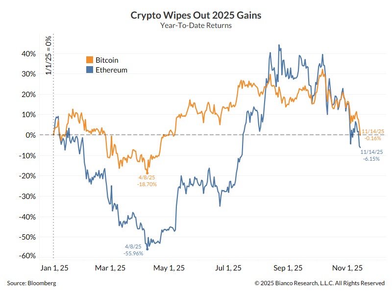 Crypto erased all 2025 gains as of November 15th, 2025. Source: businessinsider