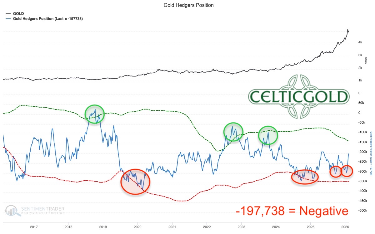 Commitments of Traders Report for gold futures as of 10th February 2026. Source: Sentimenttrader