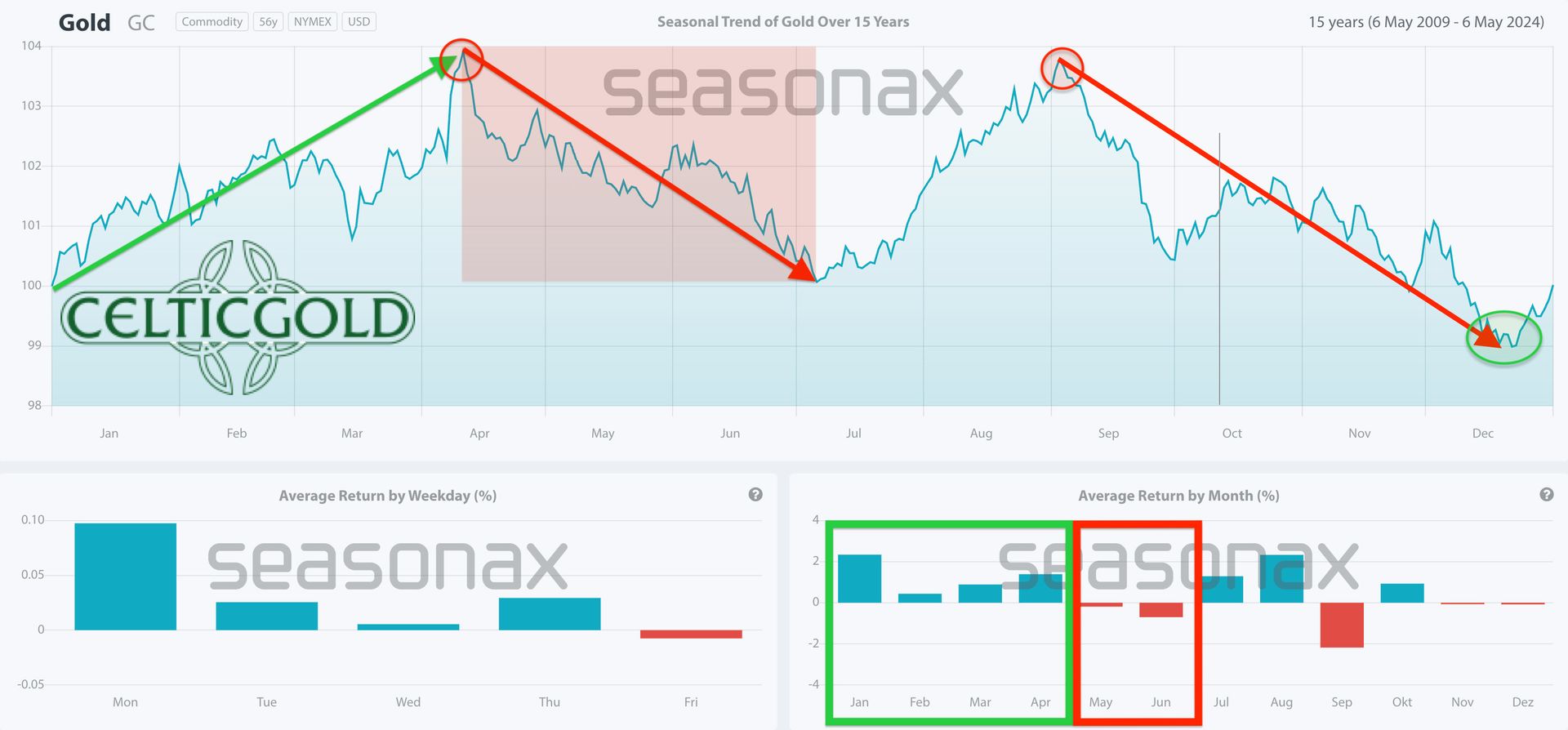 Seasonality for Gold Prices Over the Last 15 Years as of April 28, 2024. Source: Seasonax
